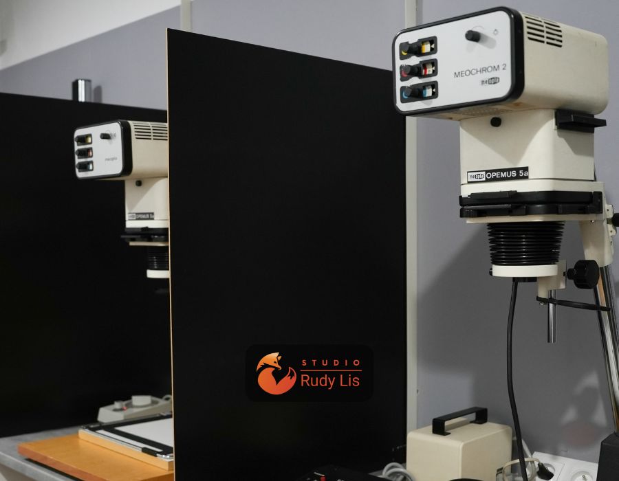 - 3 stanowiska z powiększalnikami (1x Meopta Magnifax 4 i 2x Meopta Opemus 5A) i zegarami ciemniowymi